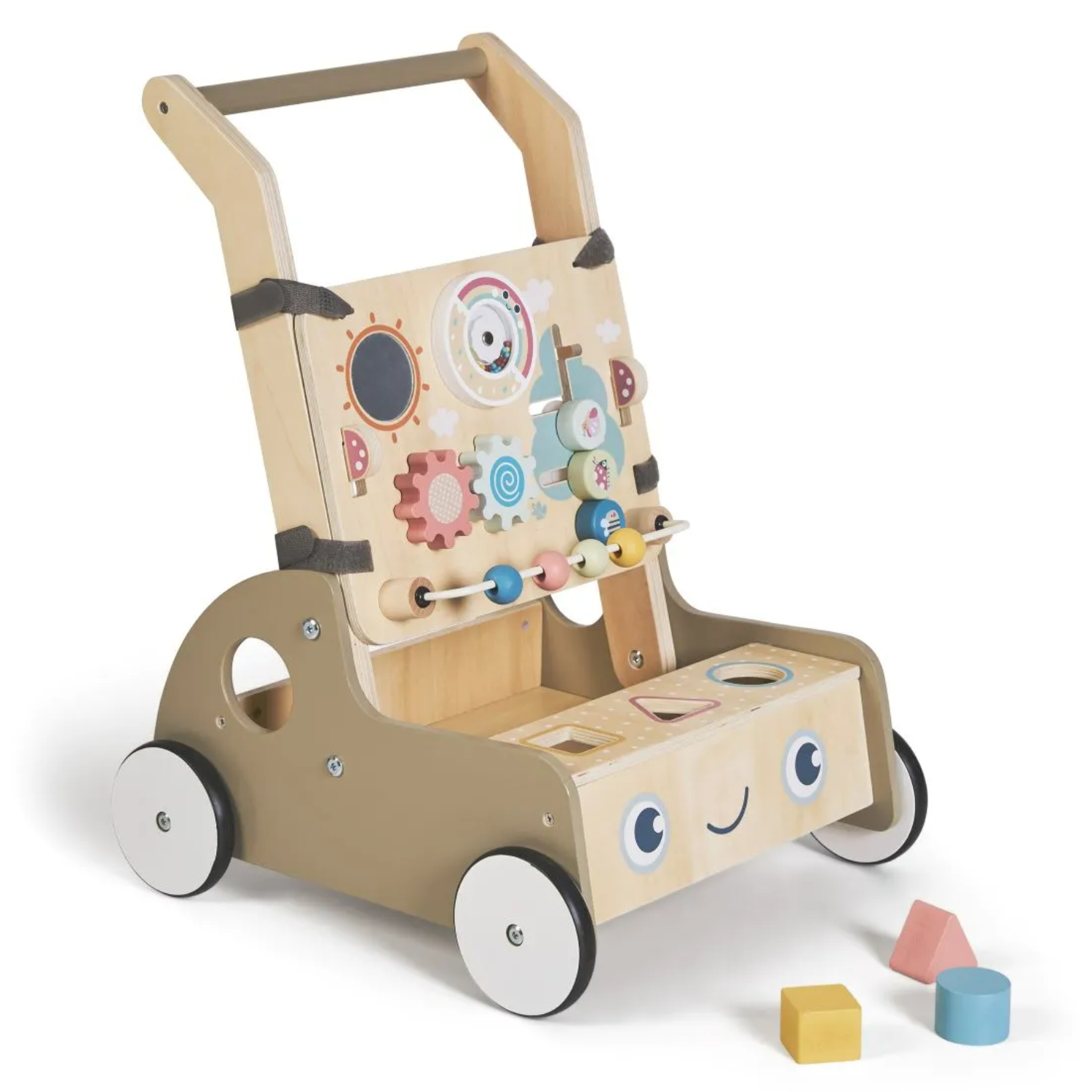 Además de ayudar a caminar, el andador para bebé Monti ofrece múltiples opciones de juego con su bandeja extraíble y juguetes integrados, convirtiéndose en una herramienta esencial para el desarrollo temprano del bebé.
