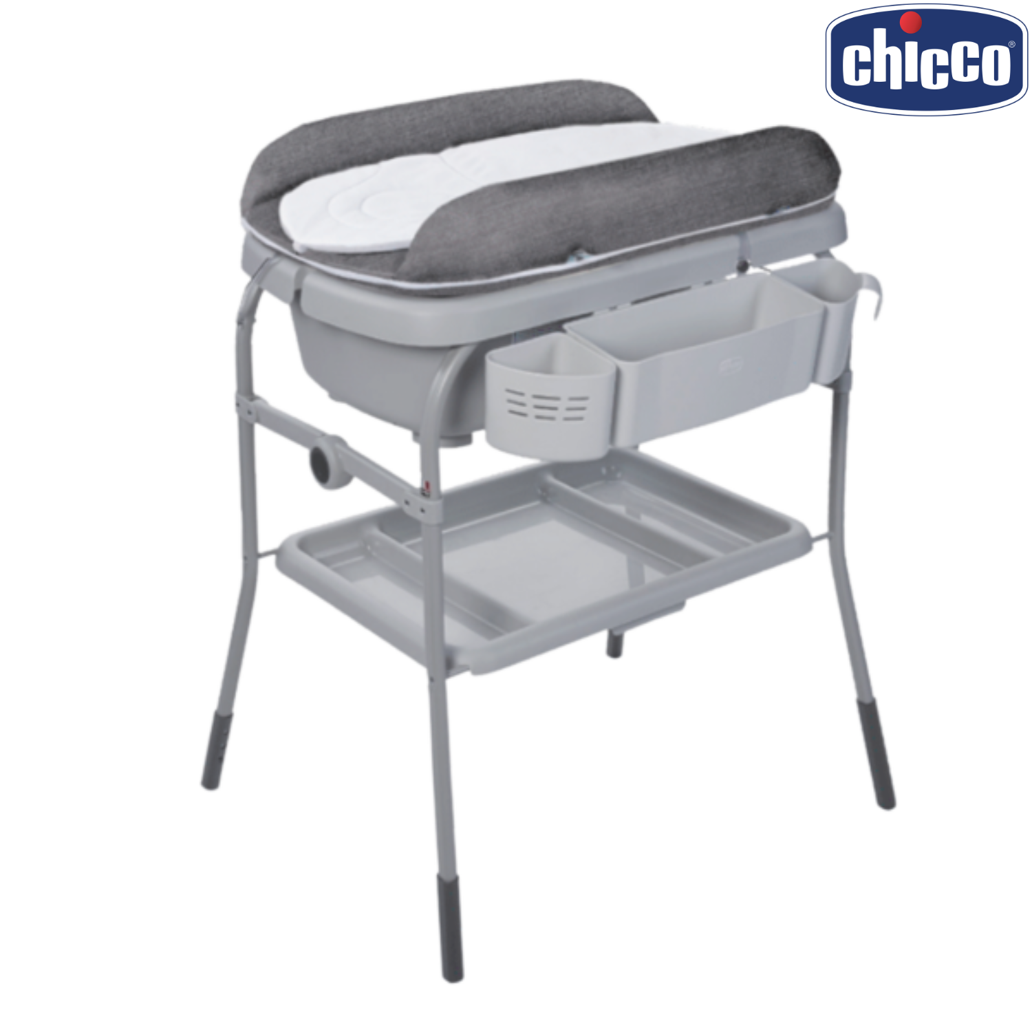 Cuddle&Bubble viene equipada con una bandeja grande para guardar toallas y pañales, un compartimento lateral de almacenamiento, un porta esponja y una jarra para el lavado de cabeza.