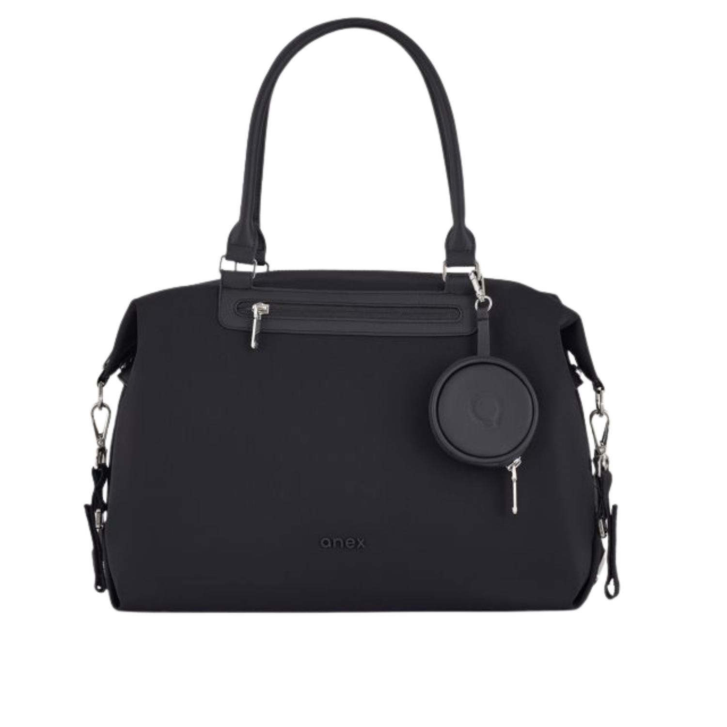 Las correas universales permiten sujetar el bolso en cualquier cochecito. Un pequeño D-ring con logo sostiene la correa de hombro o se engancha al cochecito. *Por favor, verifica la compatibilidad de Eli, IQ y IQ Basic usando el enlace proporcionado.