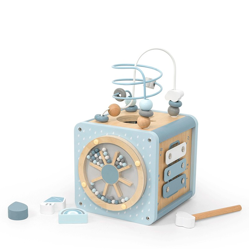 El cubo de actividades 5 en 1 viene con un clasificador de formas, engranajes, un laberinto de pistas, un xilófono y un laberinto de cuentas para mantener a los niños entretenidos.