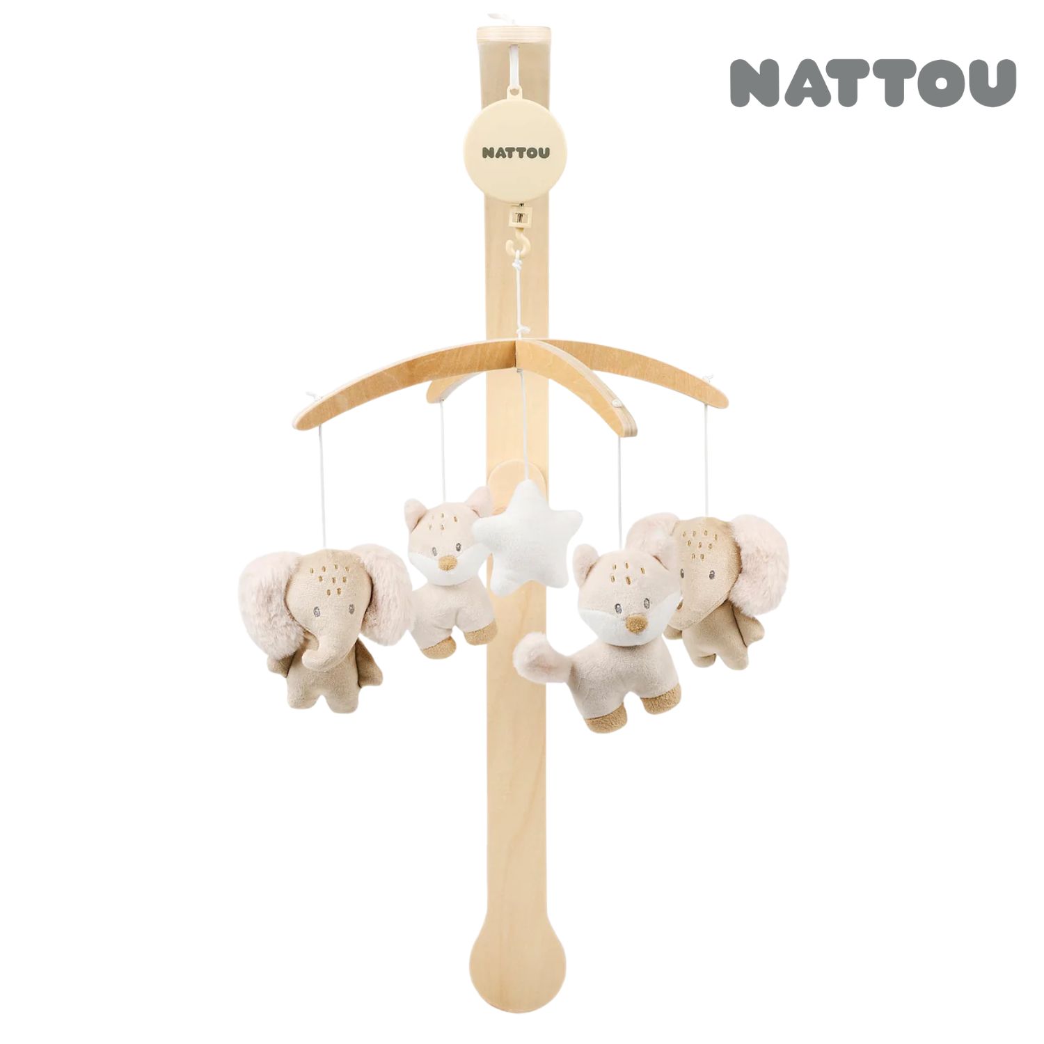 Móvil musical con figuras de peluche giratorias y la suave melodía “Le-La-Lu”.