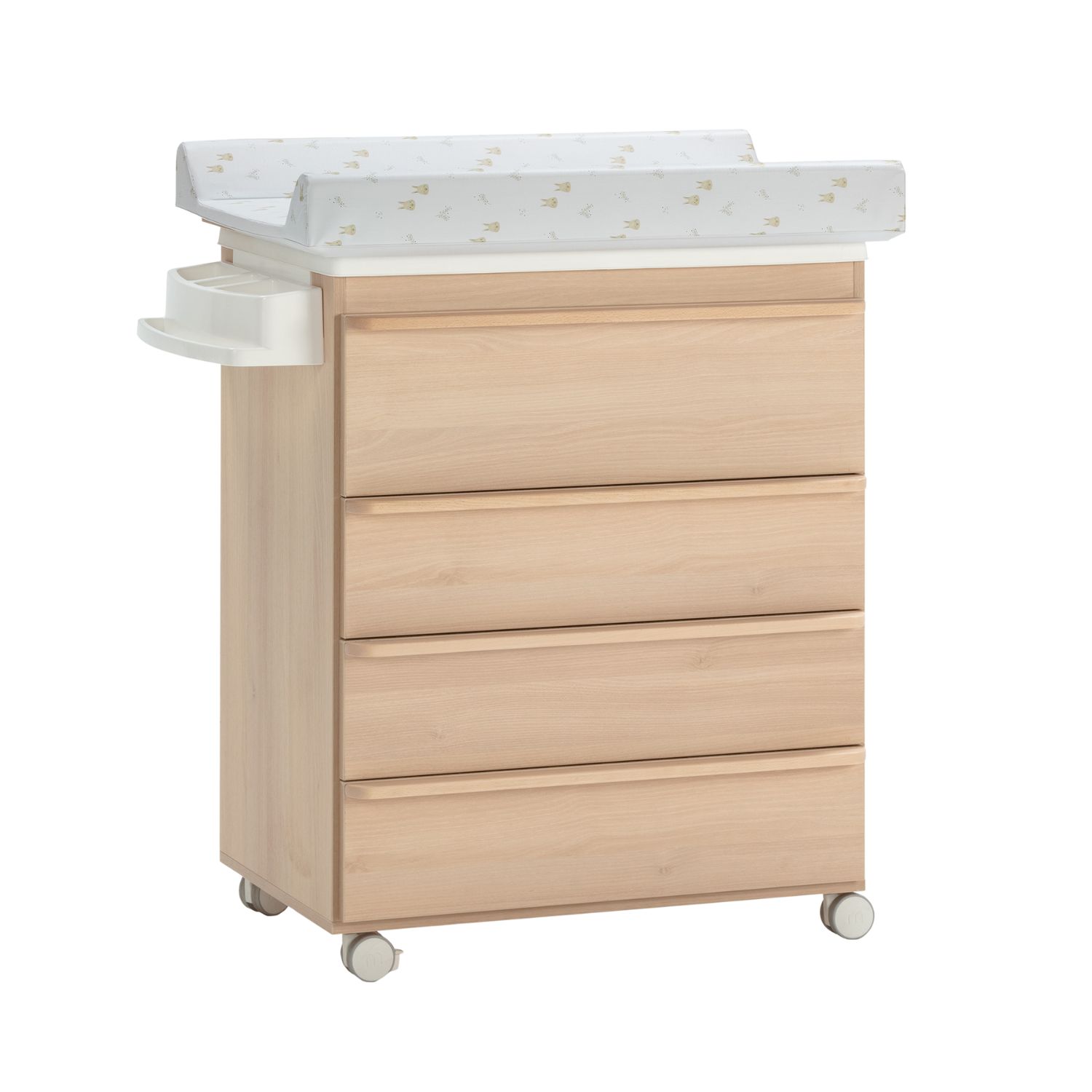 Convertible en cómoda cambiando las ruedas por patas fijas y retirando la cubeta y demás elementos de bañera
